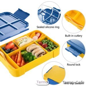 Lleva tus comidas perfectamente organizadas con esta fiambrera tipo Bento de 1330 ml. 6 compartimentos, cubiertos incluidos y 3 mini-recipientess herméticos. Ideal para niños y adultos.
