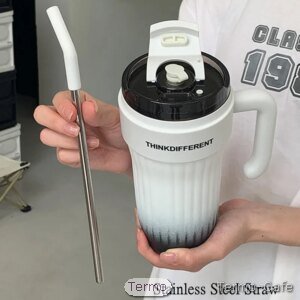La tapa superior cuenta con dos sistemas de uso: puedes beber directamente desde el borde o utilizar la pajita de acero inoxidable reutilizable incluida. Esta característica lo convierte en una excelente opción tanto para agua, zumos o batidos fríos como para café, té o infusiones calientes.